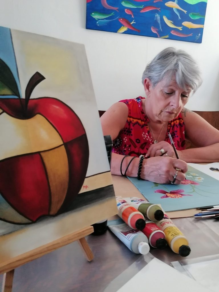 Martine a pu ainsi retracer son parcours de vie en tant que senior à la retraite ayant appris la peinture avec un grand maitre de la peinture paysanne.